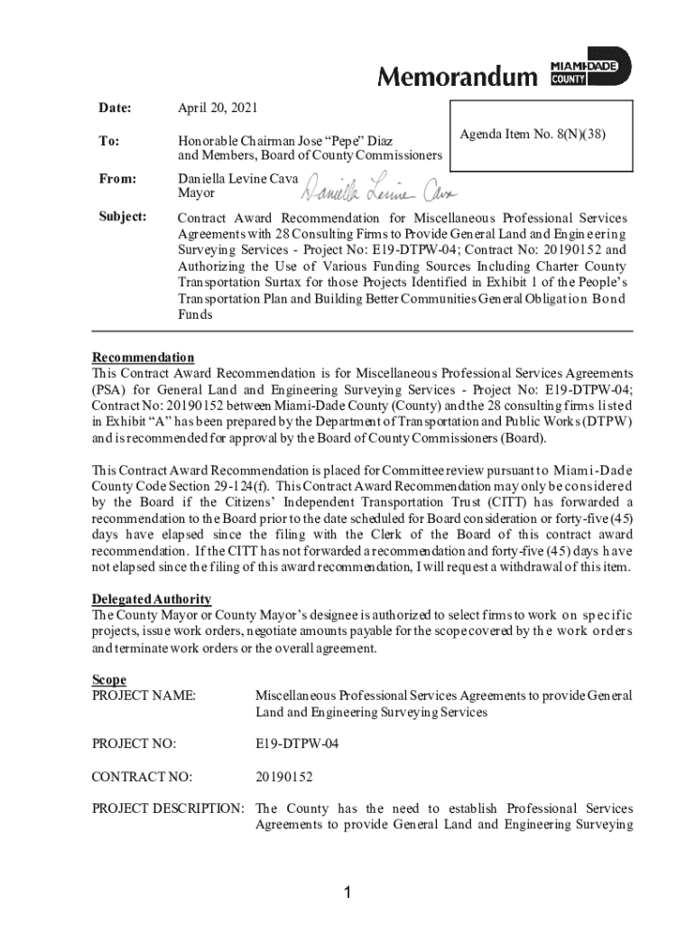 Date:April 20, 2021To:Honorable Chairman Jose Pepe Diaz and Members, Board of County CommissionersFrom:Daniella Levine Cave MayorSubject:Contract Award Recommendation for Miscellaneous Professional