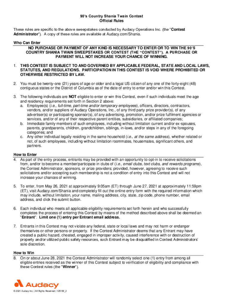 90s Country Shania Twain Contest Official Rules These rules are specific to the above sweepstakes conducted by Audrey Operations Inc. (the Contest Administrator). A copy of these rules are available