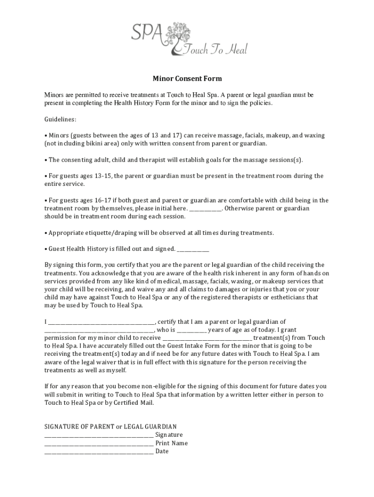 MinorConsentForm Minors are permitted to receive treatments at Touch to Heal Spa. A parent or legal guardian must be present in completing the Health History Form for the minor and to sign the policies.