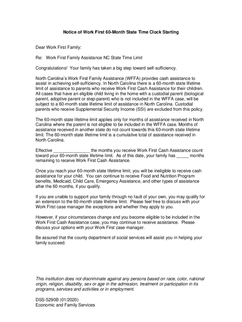 Notice of Work First 60Month State Time Clock Stringier Work First Family: Re: Work First Family Assistance NC State Time Limit Congratulations! Your family has taken a big step toward self-sufficiency.