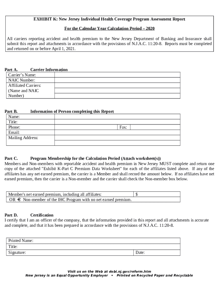 Instructions for the form EXHIBIT K: New Jersey Individual Health Coverage Program ...