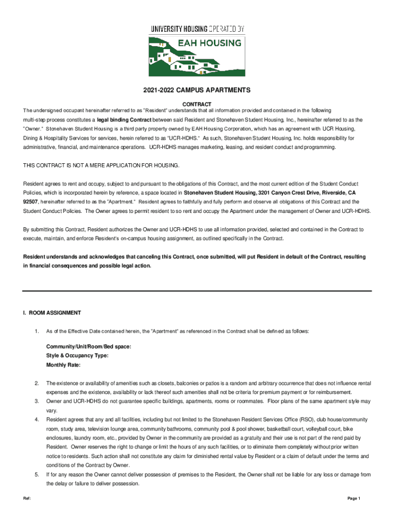 20212022 CAMPUS APARTMENTS CONTRACT The undersigned occupant hereinafter referred to as Resident understands that all information provided and contained in the following multistep process constitutes