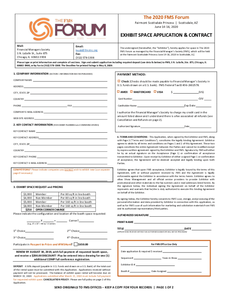 The 2020 FMS Forum Fairmont Scottsdale Princess Scottsdale, AZ June 1416, 2020EXHIBIT SPACE APPLICATION & CONTRACT Mail: Financial Managers Society 1 N. Basally St., Suite 875 Chicago, IL 606023908Email: