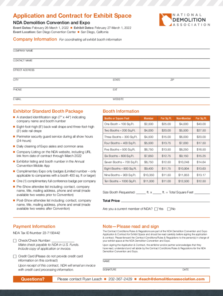 Application and Contract for Exhibit Space NDA Demolition Convention and Expo Event Dates: February 26March 1, 2022 Exhibit Dates: February 27March 1, 2022 Event Location: San Diego Convention Center