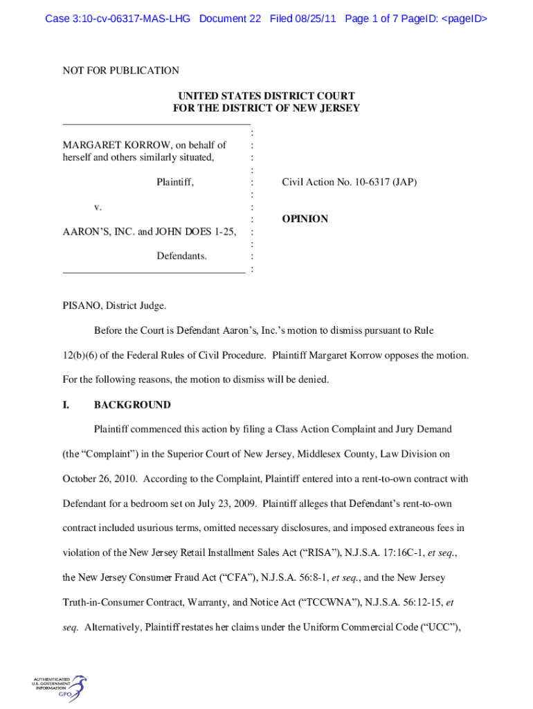 Case 3:10cv06317MASLHG Document 22 Filed 08/25/11-Page 1 of 7 Paged: pageant FOR PUBLICATION UNITED STATES DISTRICT COURT FOR THE DISTRICT OF NEW JERSEY : MARGARET BORROW, on behalf of : herself and