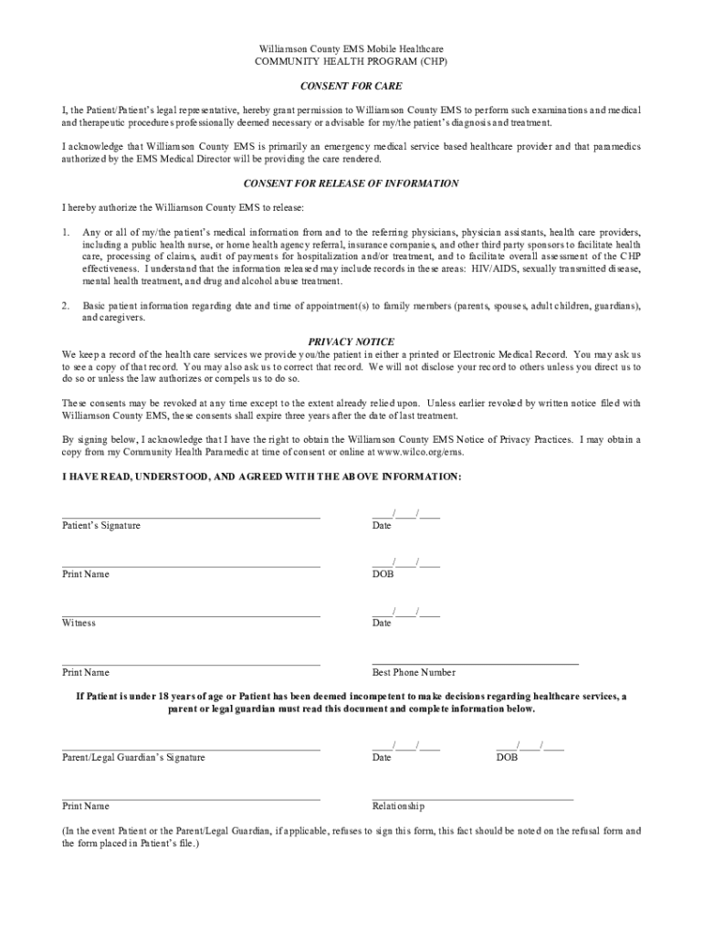 Williamson County EMS Mobile Healthcare COMMUNITY HEALTH PROGRAM (CHP) CONSENT FOR CARE I, the Patient/Patients legal representative, hereby grant permission to Williamson County EMS to perform such