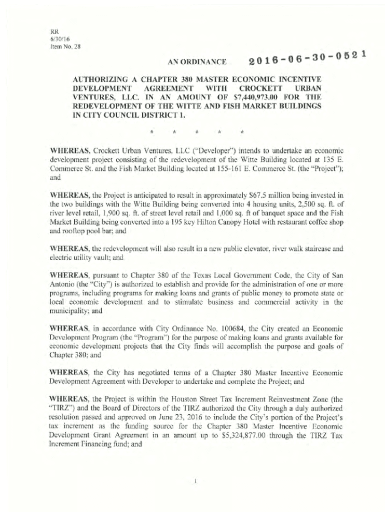 RR6/30116 Item No. 28201606300521AN ORDINANCEAUTHORIZING A CHAPTER 380 MASTER ECONOMIC INCENTIVE DEVELOPMENT AGREEMENT WITH CROCKETT URBAN VENTURES, LLC. IN AN AMOUNT OF $7,440,973.00 FOR THE REDEVELOPMENT