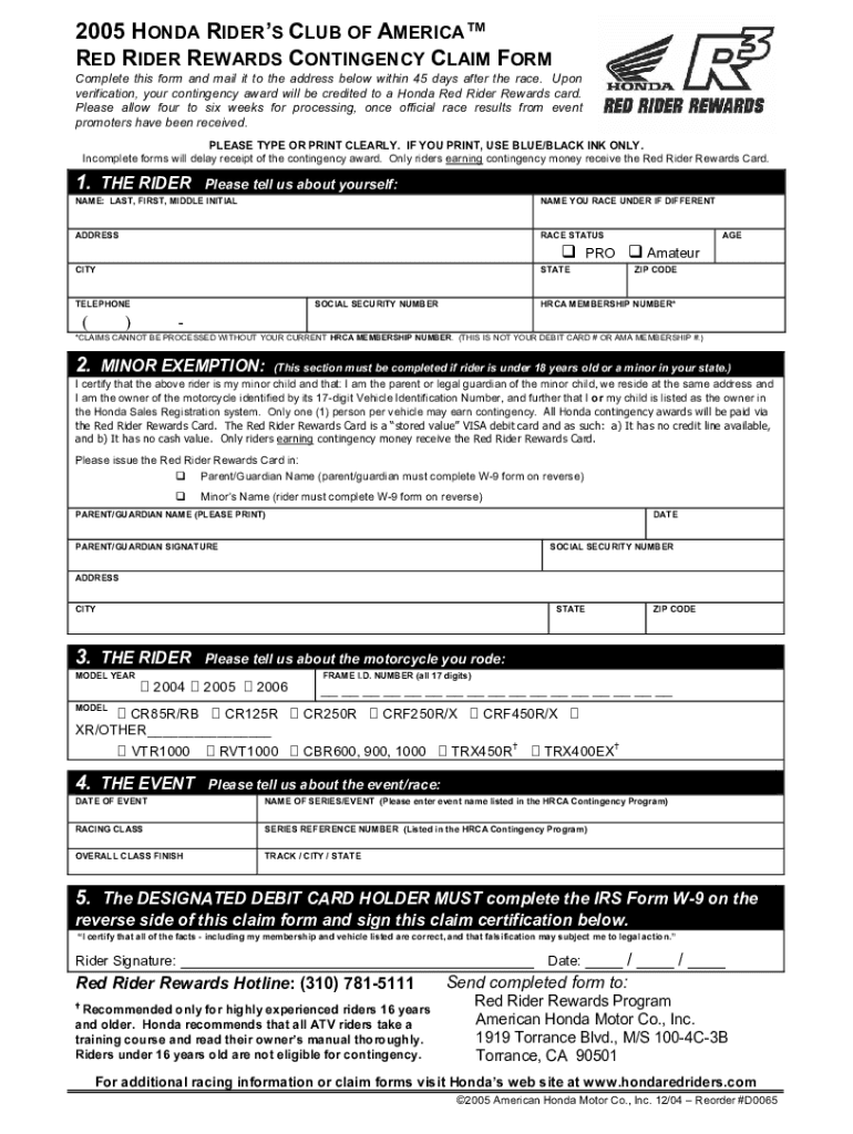 2005 HONDA RIDERS CLUB OF AMERICA RED RIDER REWARDS CONTINGENCY CLAIM FORM Complete this form and mail it to the address below within 45 days after the race. Upon verification, your contingency award