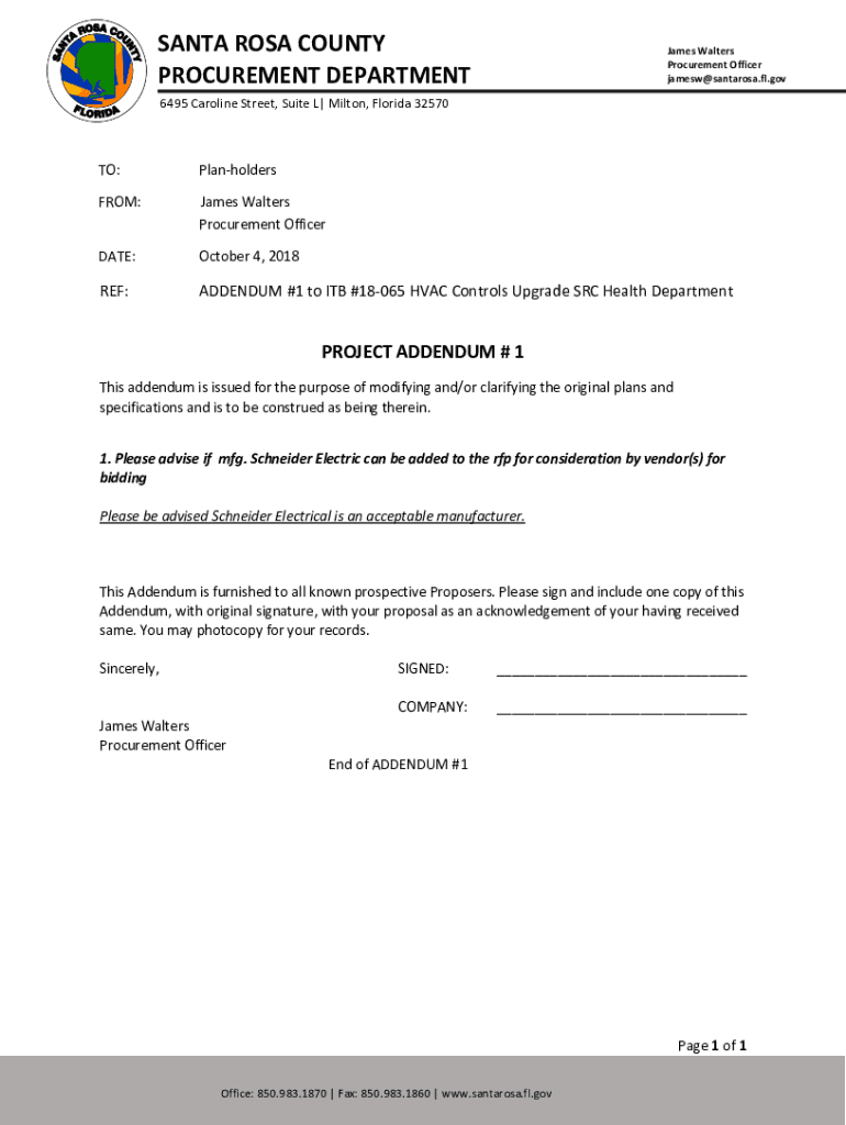 SANTA ROSA COUNTY PROCUREMENT DEPARTMENT James Walters Procurement Officer James Santos.fl.gov6495 Caroline Street, Suite L Milton, Florida 32570TO:PlanholdersFROM:James Walters Procurement Officiate:October