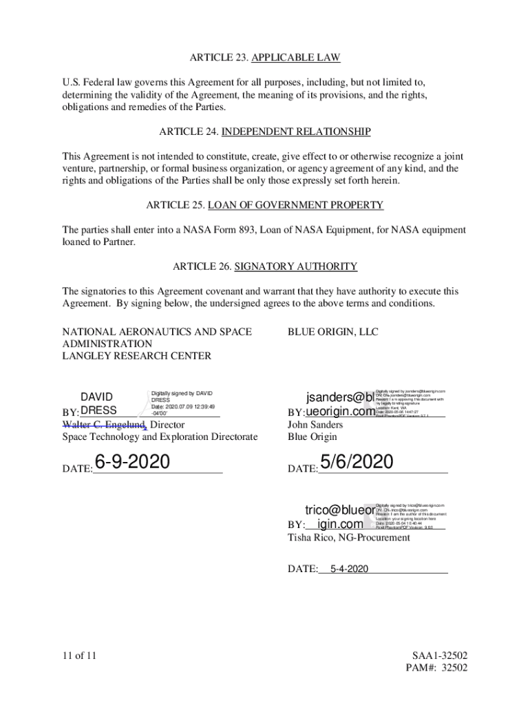 REIMBURSABLE SPACE ACT AGREEMENT, SAA132502 BETWEEN THE NATIONAL AERONAUTICS AND SPACE ADMINISTRATION LANGLEY RESEARCH CENTER AND BLUE ORIGIN, LLC FOR BUFFET PRESSURE DATABASE DEVELOPMENTARTICLE 1.