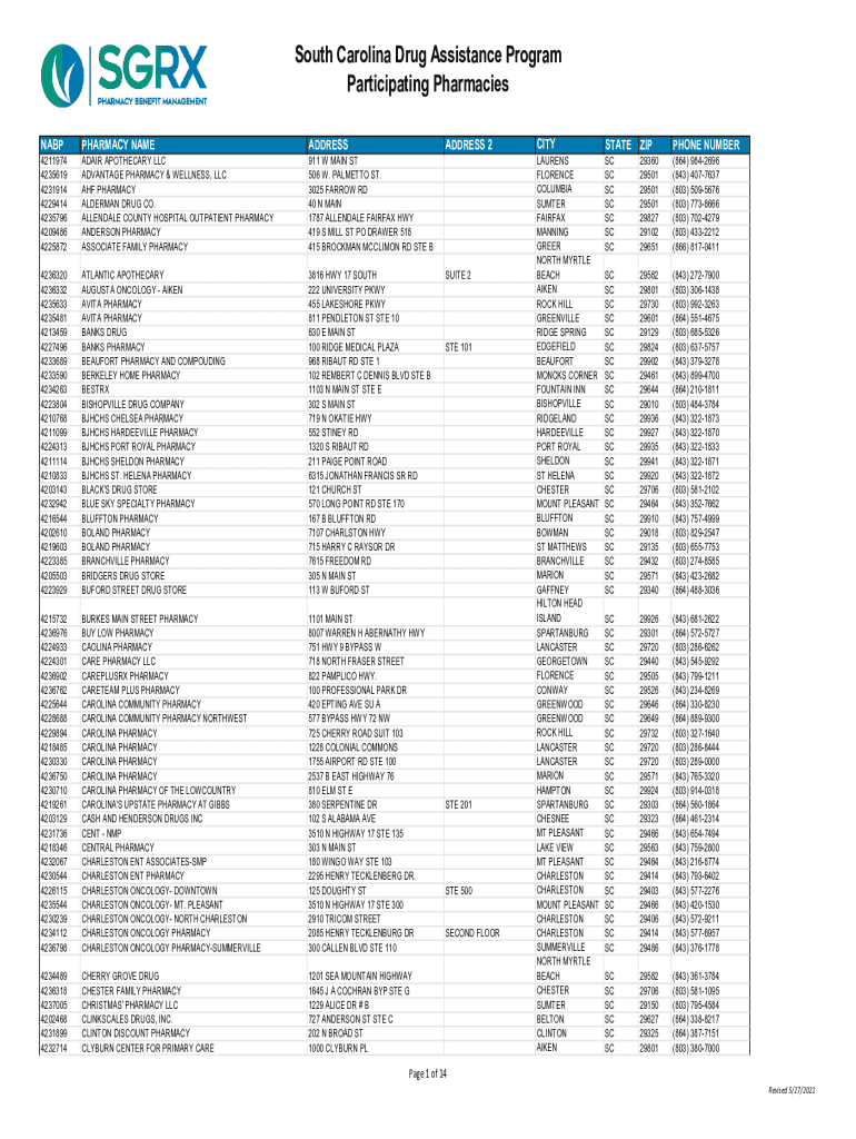 South Carolina Drug Assistance Program Participating Pharmacies NABPPHARMACY NAMEADDRESSADDRESS 2SUITE 24211974 4235619 4231914 4229414 4235796 4209486 4225872ADAIR APOTHECARY LLC ADVANTAGE PHARMACY