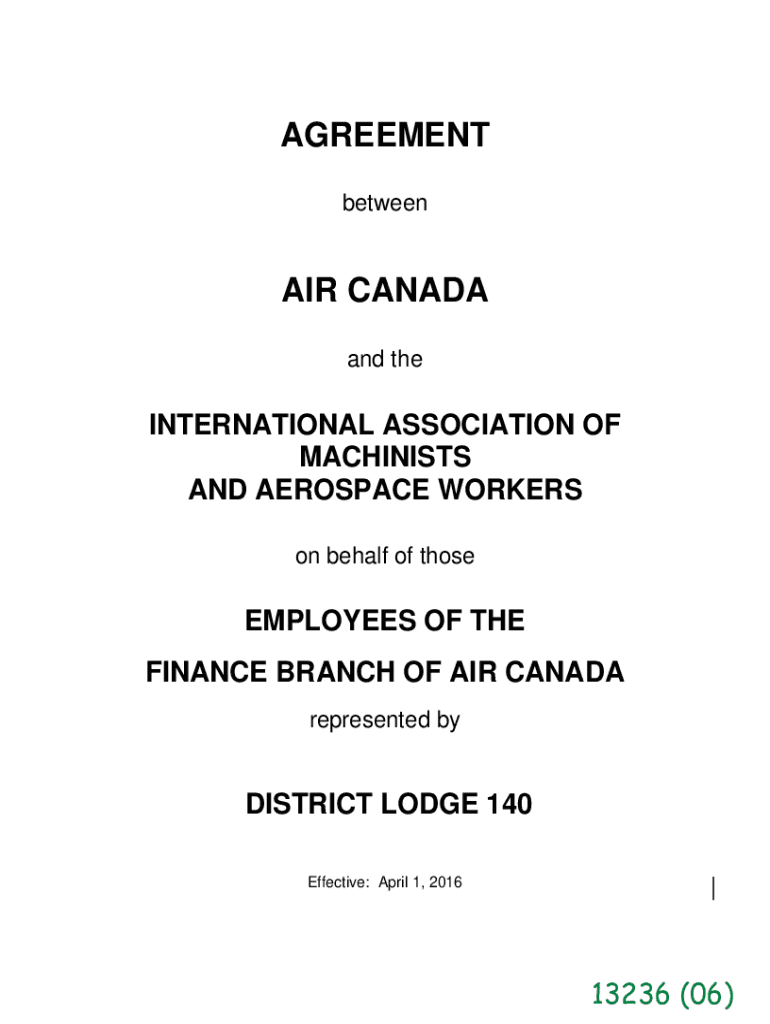 AGREEMENT between CANADA and international ASSOCIATION OF MACHINISTS AND AEROSPACE WORKERS on behalf of thoseEMPLOYEES OF THE FINANCE BRANCH OF AIR CANADA represented district LODGE 140 Effective: