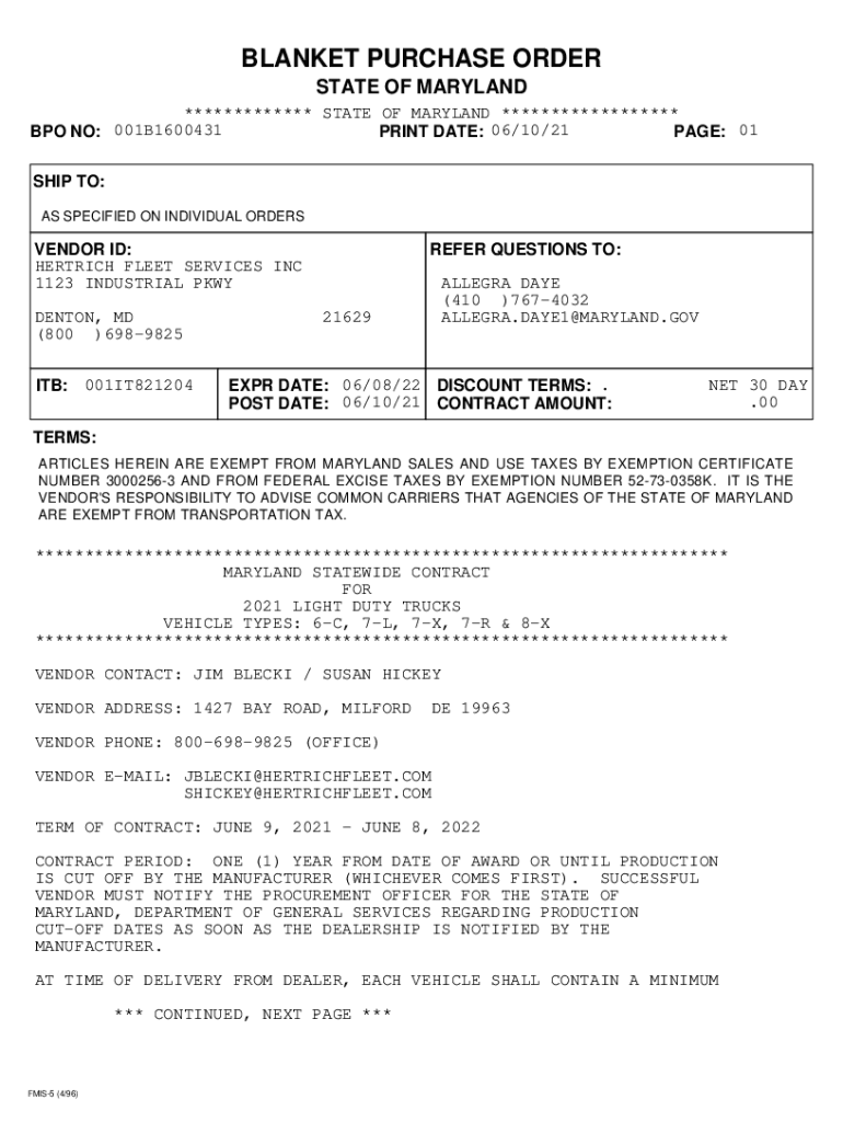 BLANKET PURCHASE ORDER STATE OF MARYLAND ************* STATE OF MARYLAND ****************** 001B1600431 BPO NO: PRINT DATE: 06/10/21 PAGE: 01 SHIP TO: AS SPECIFIED ON INDIVIDUAL ORDERSVENDOR ID: HEINRICH