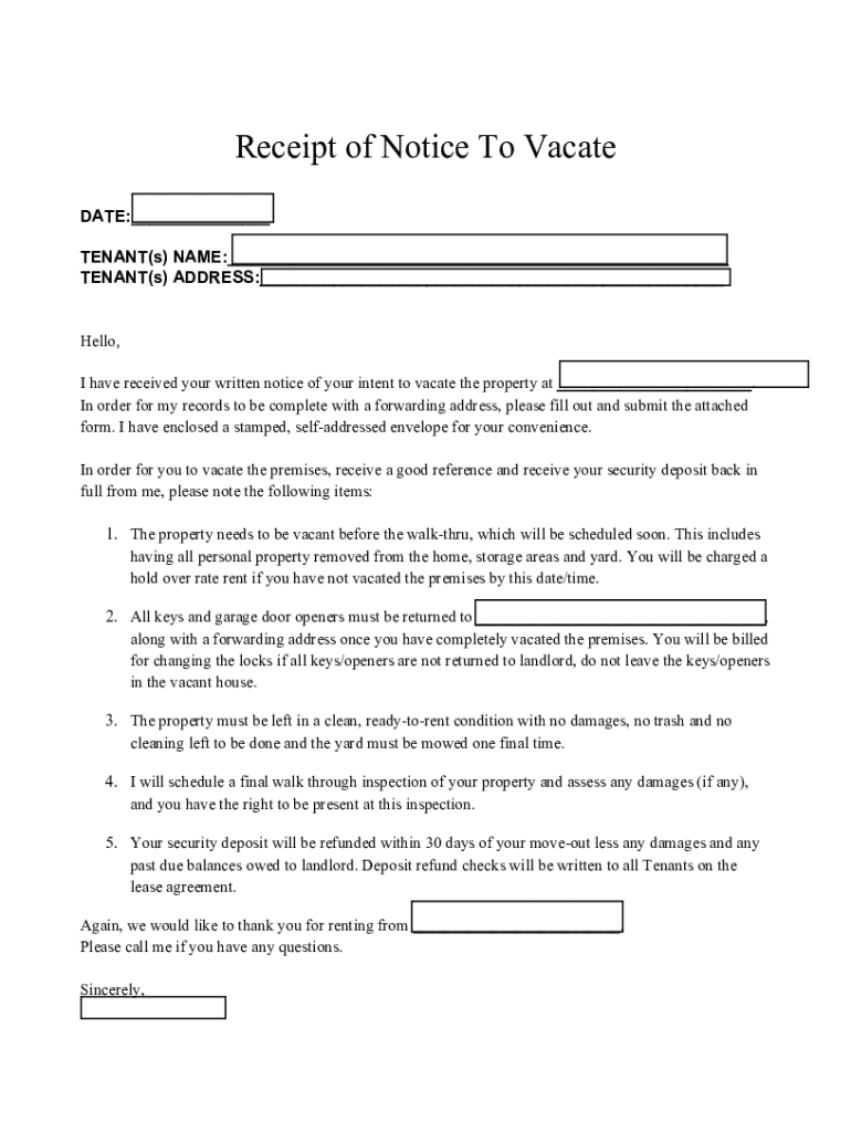 Receipt of Notice To Vacate DATE: TENANT(s) NAME: TENANT(s) ADDRESS: Hello, I have received your written notice of your intent to vacate the property at. In order for my records to be complete with