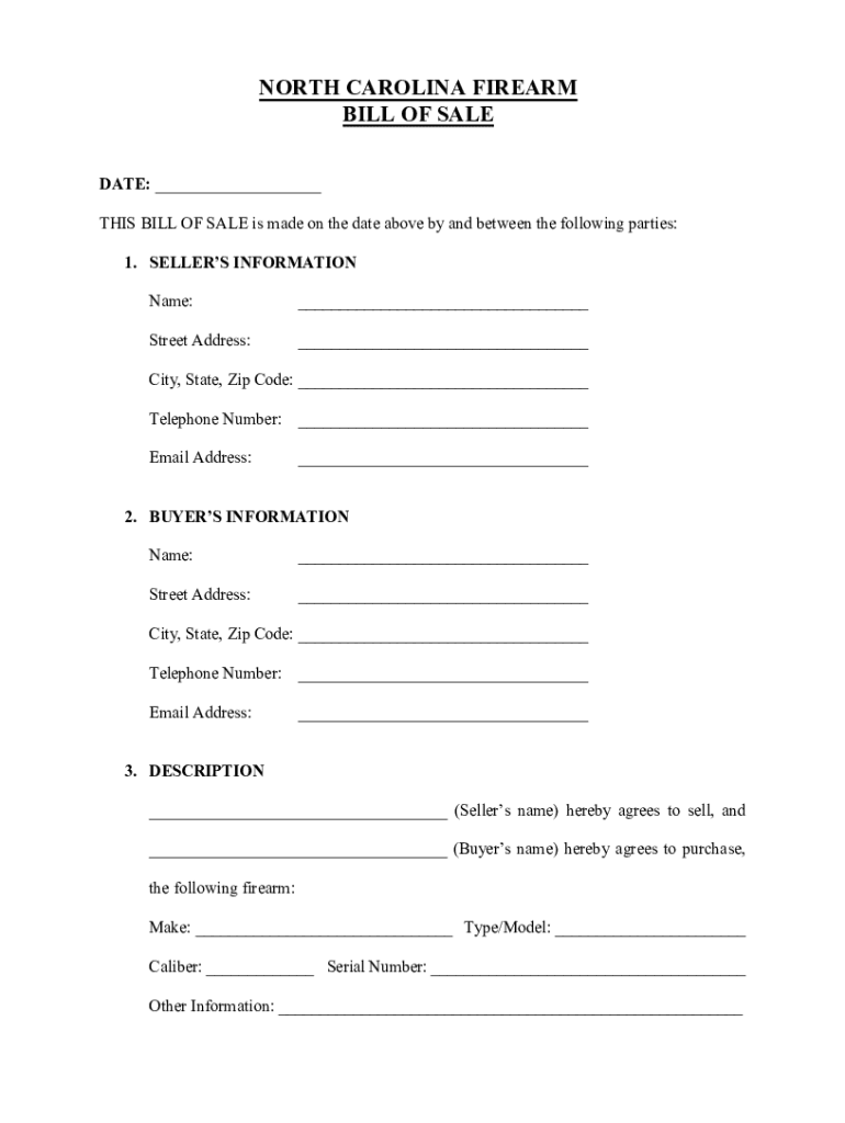 NORTH CAROLINA FIREARM BILL OF SALE DATE: THIS BILL OF SALE is made on the date above by and between the following parties: 1. SELLERS INFORMATION Name: Street Address: City, State, Zip Code: Telephone