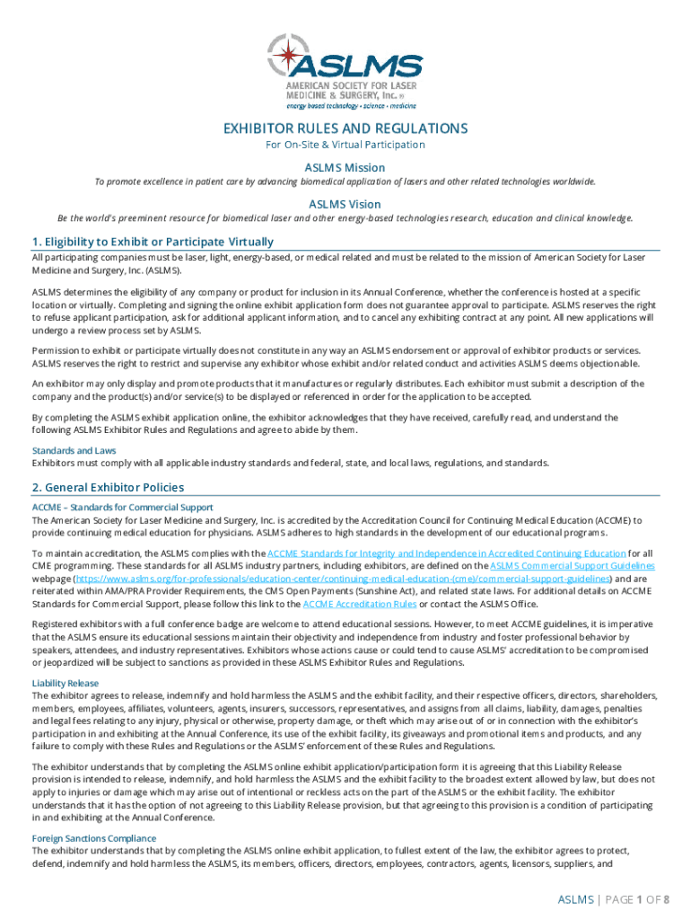 EXHIBITOR RULES AND REGULATIONS For Onsite & Virtual ParticipationASLMS Mission To promote excellence in patient care by advancing biomedical application of lasers and other related technologies worldwide.