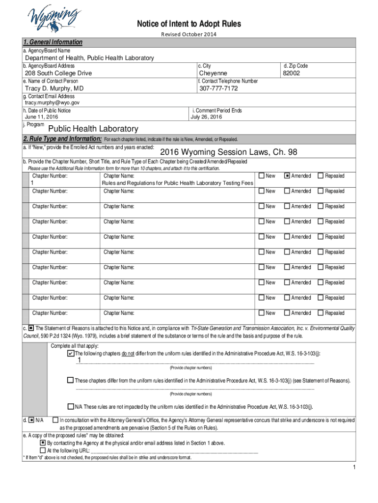 Notice of Intent to Adopt Rules Revised October 20141. General Information a. Agency/Board NameDepartment of Health, Public Health Laboratory b. Agency/Board Address208 South College Drive e. Name