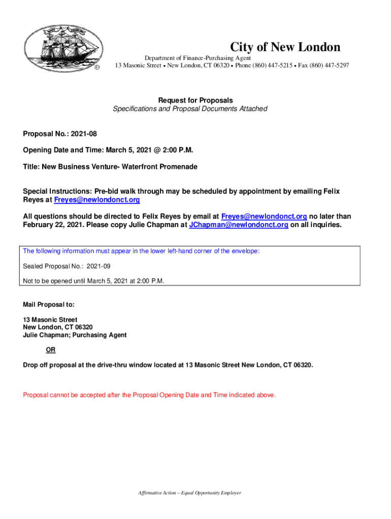 City of New London Department of FinancePurchasing Agent 13 Masonic Street New London, CT 06320 Phone (860) 4475215 Fax (860) 4475297Request for Proposals Specifications and Proposal Documents AttachedProposal
