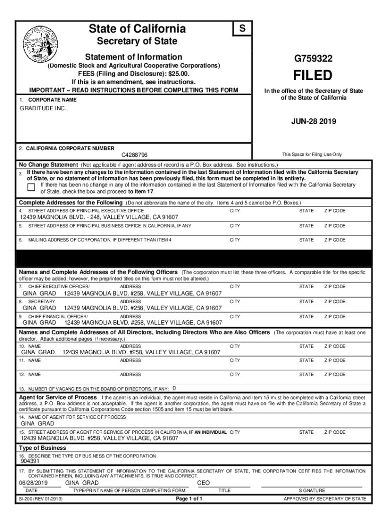 State of CaliforniaSSecretary of State Statement of InformationG759322(Domestic Stock and Agricultural Cooperative Corporations)FEES (Filing and Disclosure): $25.00. If this is an amendment, see instructions.FILEDIMPORTANT