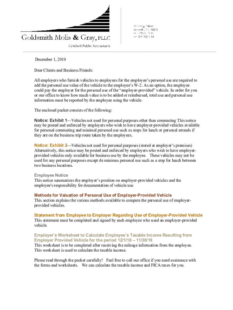 December 1, 2019, Dear Clients and Business Friends: All employers who furnish vehicles to employees for the employees personal use are required to add the personal use value of the vehicle to the