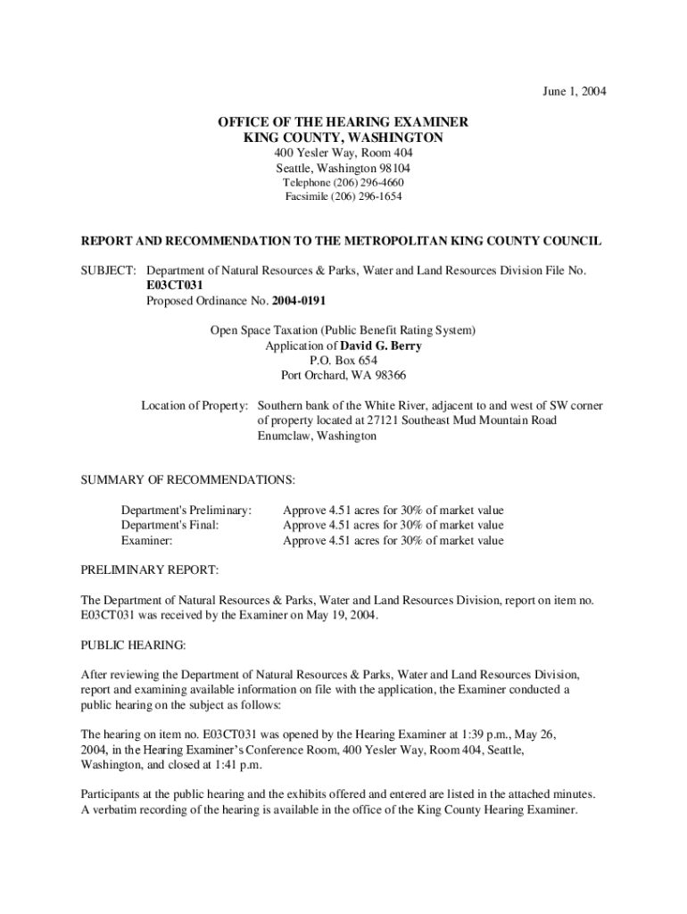 June 1, 2004OFFICE OF THE HEARING EXAMINER KING COUNTY, WASHINGTON 400 Lesser Way, Room 404 Seattle, Washington 98104 Telephone (206) 2964660 Facsimile (206) 2961654REPORT AND RECOMMENDATION TO THE