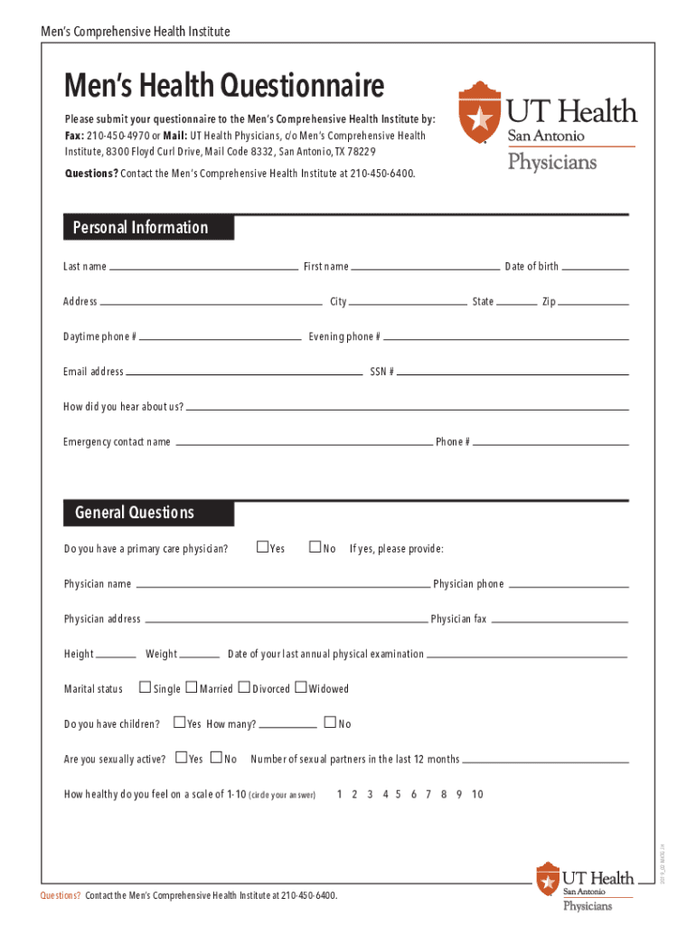 Men Comprehensive Health Institutions Health QuestionnairePlease submit your questionnaire to the Men Comprehensive Health Institute by: Fax: 2104504970 or Mail: UT Health Physicians, c/o Men Comprehensive