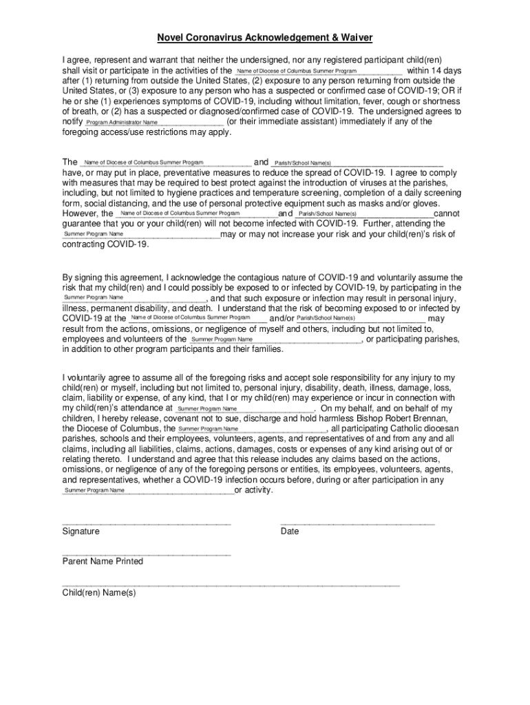 Novel Coronavirus Acknowledgement & Waiver I agree, represent and warrant that neither the undersigned, nor any registered participant child(men) Name of Diocese of Columbus Summer Program shall visit