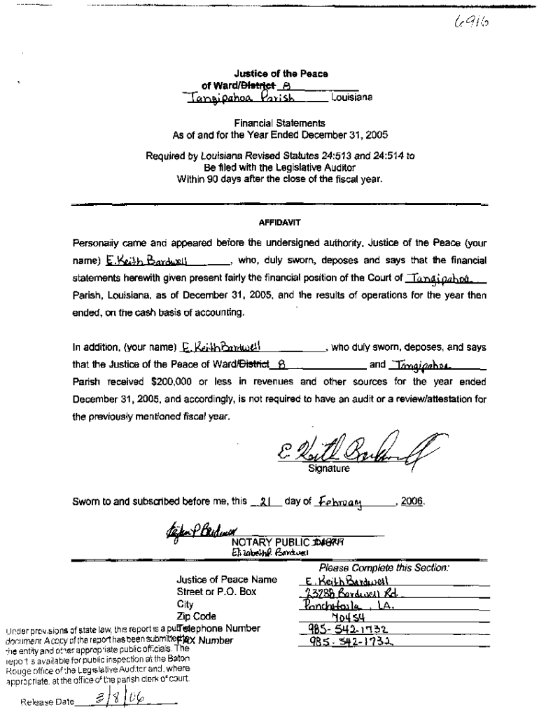 Justice of the Peace MAKE WE of Ward/Bfetrfcfr a FI9LIIVI Louisiana ft. Ski Financial Statements As of and for the Year Ended December 31, 2005, Required by Louisiana Revised Statutes 24:513 and 24:514