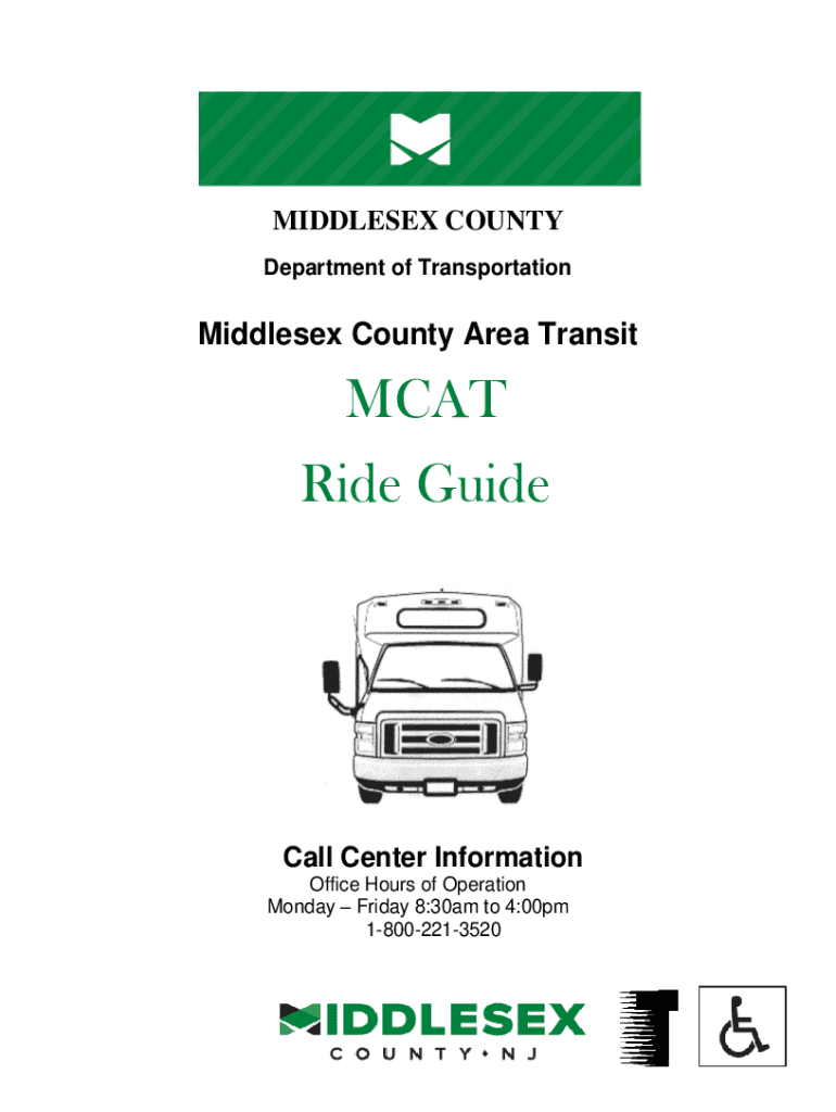 MIDDLESEX COUNTY Department of TransportationMiddlesex County Area TransitMCAT Ride Goodall Center Information Office Hours of Operation Monday Friday 8:30am to 4:00pm 18002213520Middlesex County