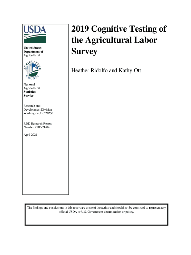 United States Department of Agricultural2019 Cognitive Testing of the Agricultural Labor Survey Heather Rodolfo and Kathy National Agricultural Statistics Service Research and Development Division