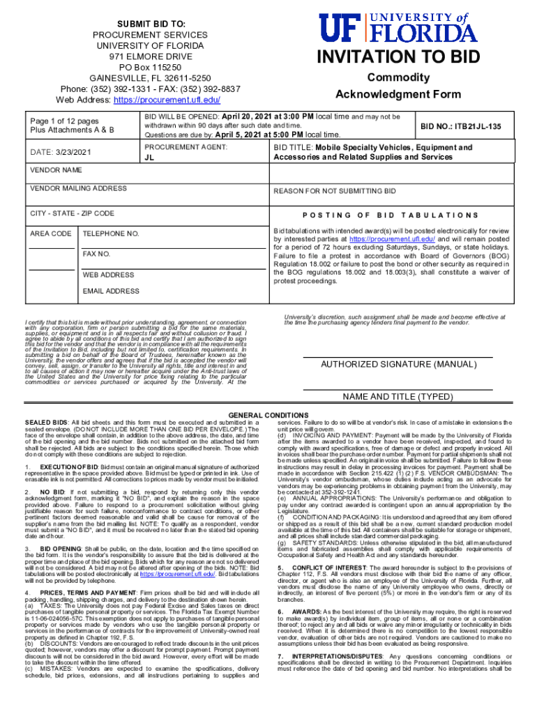 SUBMIT BID TO: PROCUREMENT SERVICES UNIVERSITY OF FLORIDA 971 ELMORE DRIVE PO Box 115250 GAINESVILLE, FL 326115250 Phone: (352) 3921331 FAX: (352) 3928837 Web Address: https://procurement.ufl.edu/