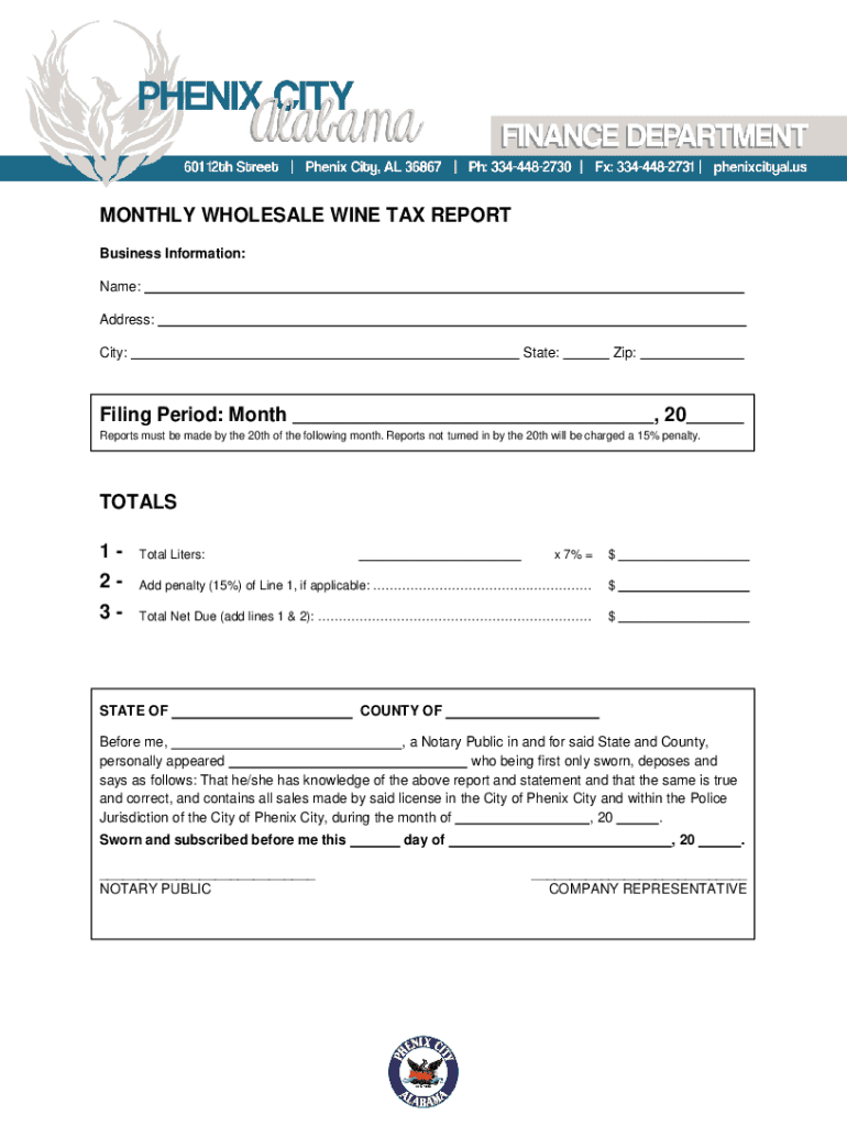MONTHLY WHOLESALE WINE TAX REPORT Business Information: Name: Address: City:State:Zip:Filing Period: Month, 20Reports must be made by the 20th of the following month. Reports not turned in by the