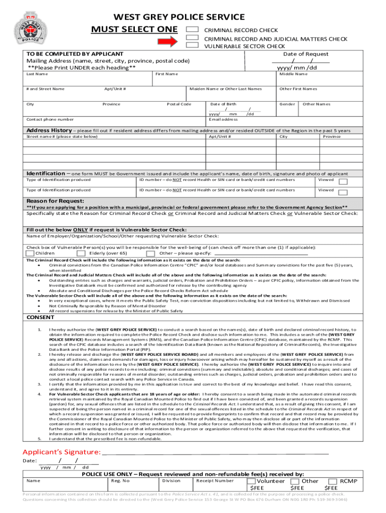 WEST GREY POLICE SERVICE MUST SELECT ONE CRIMINAL RECORD CHECK TO BE COMPLETED BY APPLICANT Mailing Address (name, street, city, province, postal code) **Please Print UNDER each heading** Last Noncriminal
