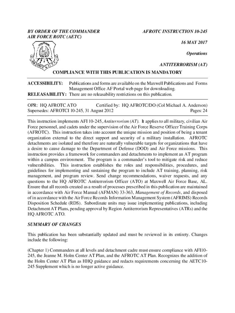 BY ORDER OF THE COMMANDER AIR FORCE ROTC (ETC)AF ROTC INSTRUCTION 10245 16 MAY 2017 Operations ANTITERRORIST (AT)COMPLIANCE WITH THIS PUBLICATION IS MANDATORY ACCESSIBILITY:Publications and forms