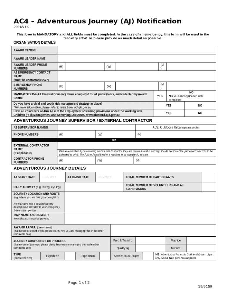 The AC4 Adventurous Journey Notification is a fillable form in MS Word extension that has to be filled-out and signed for specific reasons. In that case, it is furnished to the relevant addressee to provide specific information and data. The completion and signing can be done manually or using a trusted tool e. g. PDFfiller. These tools help to complete any PDF or Word file online. While doing that, you can customize it for the needs you have and put a legal digital signature. Once finished, the user sends the AC4 Adventurous Journey Notification to the recipient or several ones by mail or fax. PDFfiller is known for a feature and options that make your Word form printable. It has a variety of settings when printing out appearance. No matter, how you deliver a form - in hard copy or by email - it will always look neat and clear. In order not to create a new editable template from scratch all the time, turn the original document as a template. Later, you will have a customizable sample.