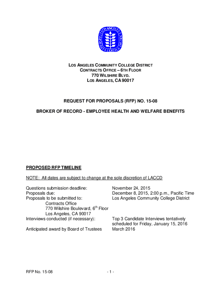LOS ANGELES COMMUNITY COLLEGE DISTRICT CONTRACTS OFFICE 6TH FLOOR 770 WILSHIRE BLVD. LOS ANGELES, CA 90017REQUEST FOR PROPOSALS (RFP) NO. 1508 BROKER OF RECORD EMPLOYEE HEALTH AND WELFARE BENEFITSPROPOSED