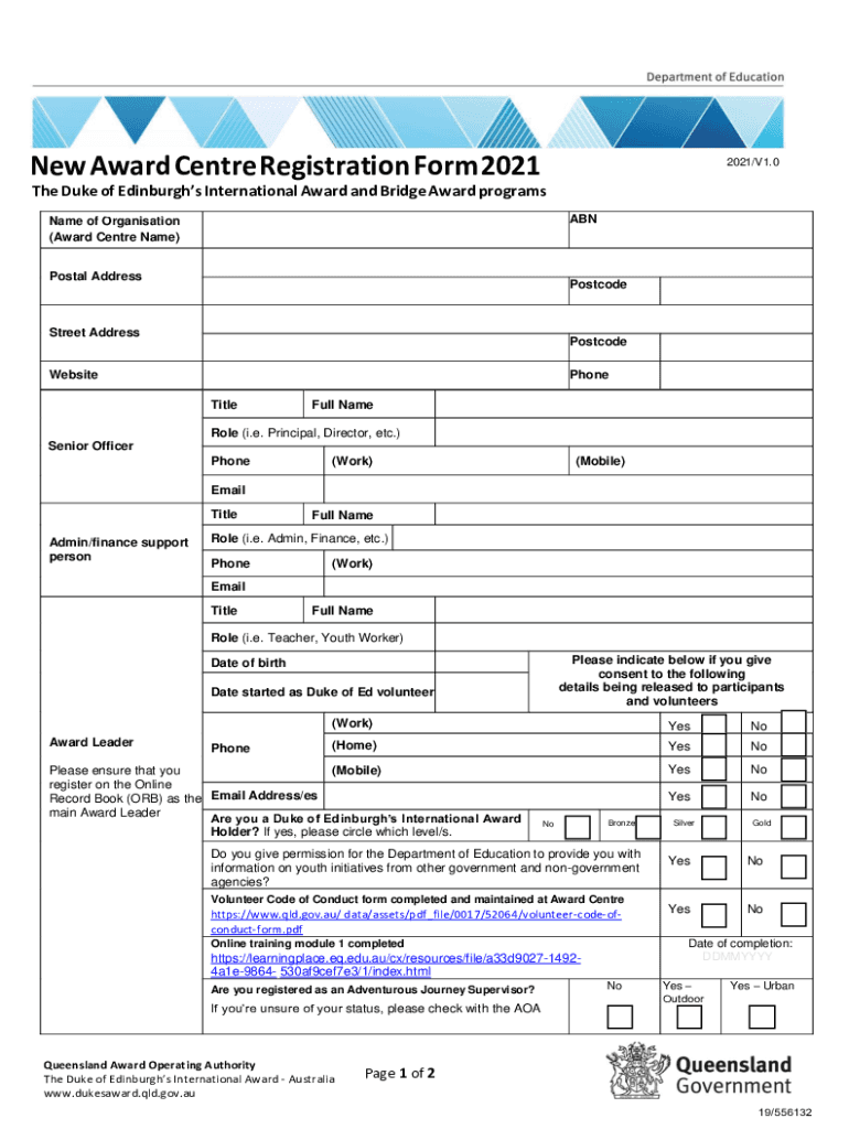 New Award Center Registration Form 20212021/V1.0The Duke of Edinburgh's International Award and Bridge Award programs innate of Organization (Award Center Name) Postal AddressPostcodeStreet AddressPostcodeWebsitePhone