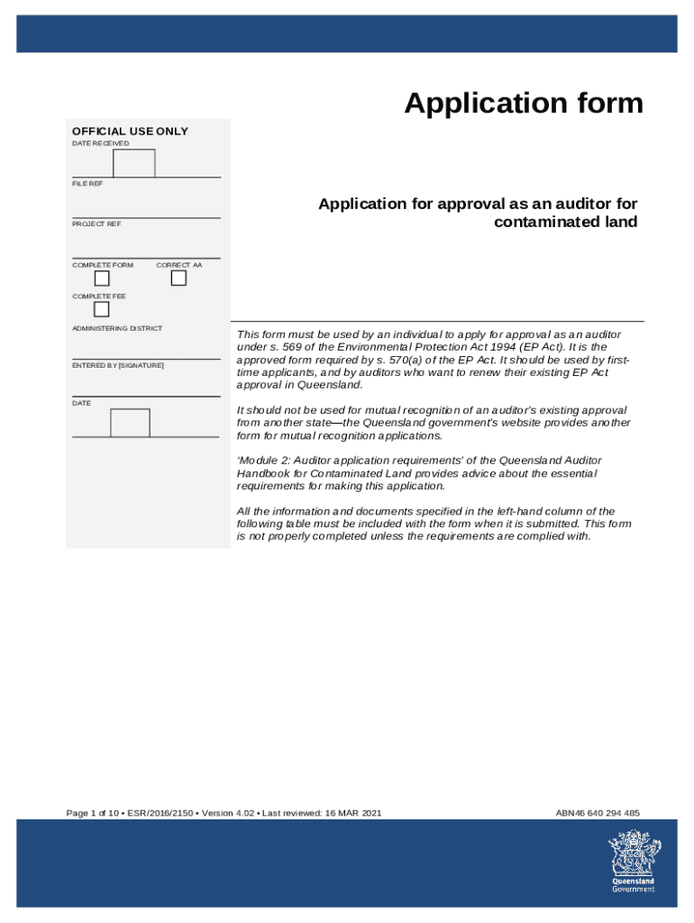 Instructions for the Application for approval as an auditor for contaminated land. Application for approval as an auditor for contaminated land form