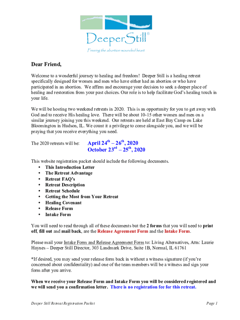 Dear Friend, Welcome to a wonderful journey to healing and freedom! Deeper Still is a healing retreat specifically designed for women and men who have either had an abortion or who have participated