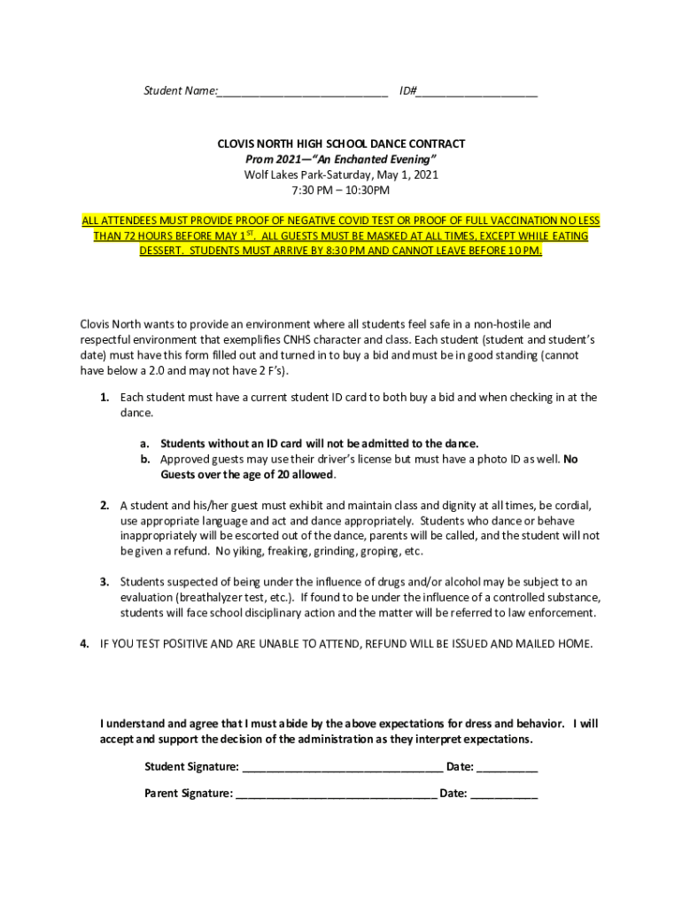 Student Name: ID# CLOVIS NORTH HIGH SCHOOL DANCE CONTRACT Prom 2021An Enchanted Evening Wolf Lakes Park Saturday, May 1, 2021 7:30 PM 10:30PM ALL ATTENDEES MUST PROVIDE PROOF OF NEGATIVE COVID-19