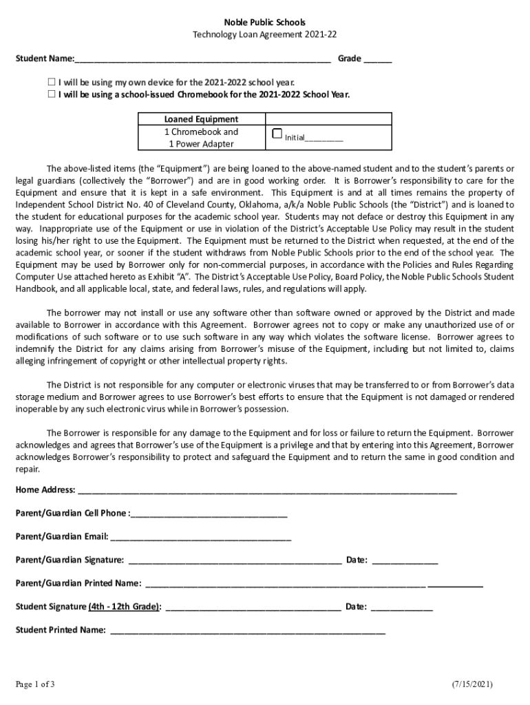 Noble Public Schools Technology Loan Agreement 202122 Student Name: Grade I will be using my own device for the 20212022 school year. I will be using a school issued Chromebook for the 20212022 School