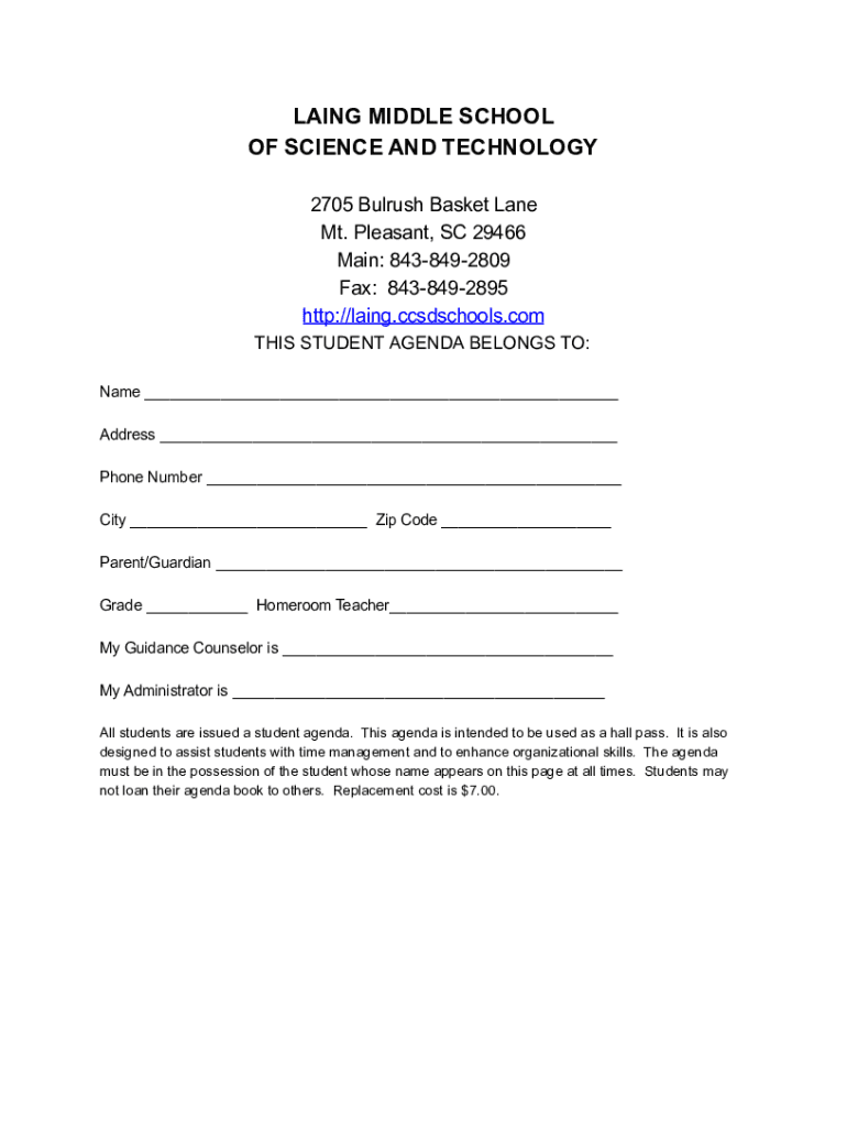 LYING MIDDLE SCHOOL OF SCIENCE AND TECHNOLOGY 2705 Bulrush Basket Lane Mt. Pleasant, SC 29466 Main: 8438492809 Fax: 8438492895 http://laing.ccsdschools.com THIS STUDENT AGENDA BELONGS TO: Name Address