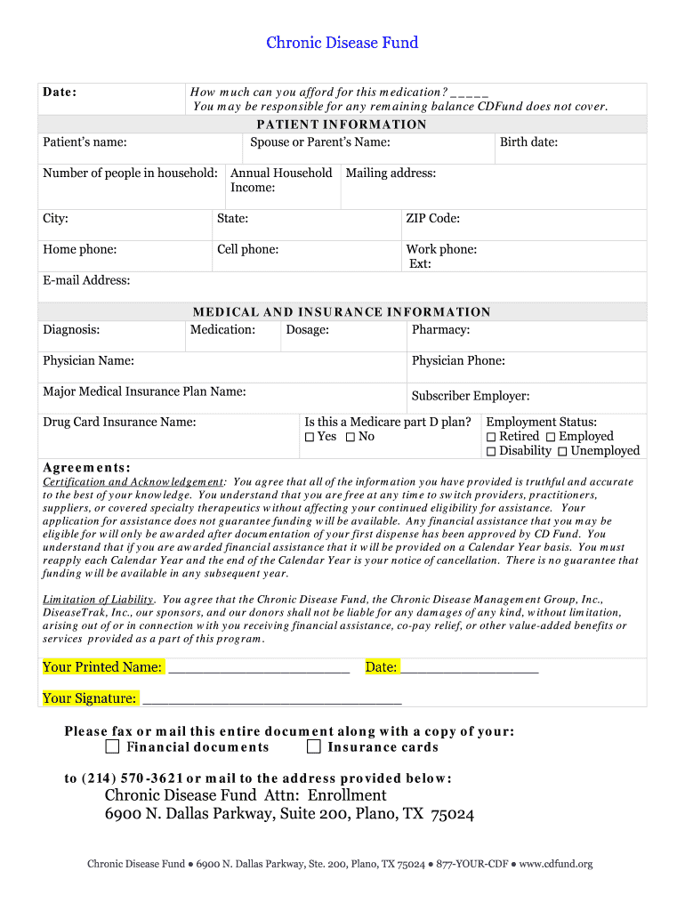 The 2012 Patient Application is a crucial document used to request healthcare financial aid, specifically aimed at assisting patients with chronic illnesses. This application is associated with the Chronic Disease Fund, which seeks to alleviate the financial burden of medication costs for eligible individuals. By completing this form, patients provide necessary details to determine their qualification for financial assistance.