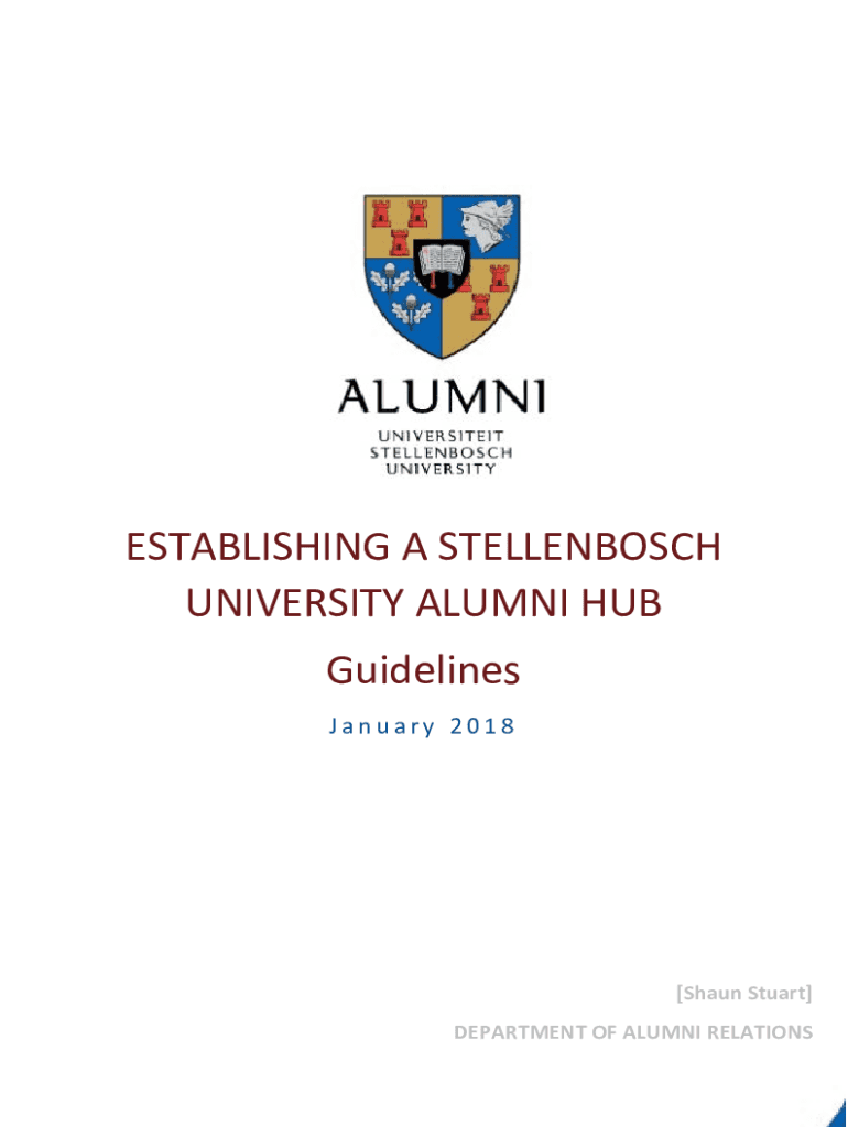 ESTABLISHING A STELLENBOSCH UNIVERSITY ALUMNI HUB Guidelines January 2018 Shaun Stuart DEPARTMENT OF ALUMNI RELATIONSTable of Contents 1. Introduction ............................................................................................................