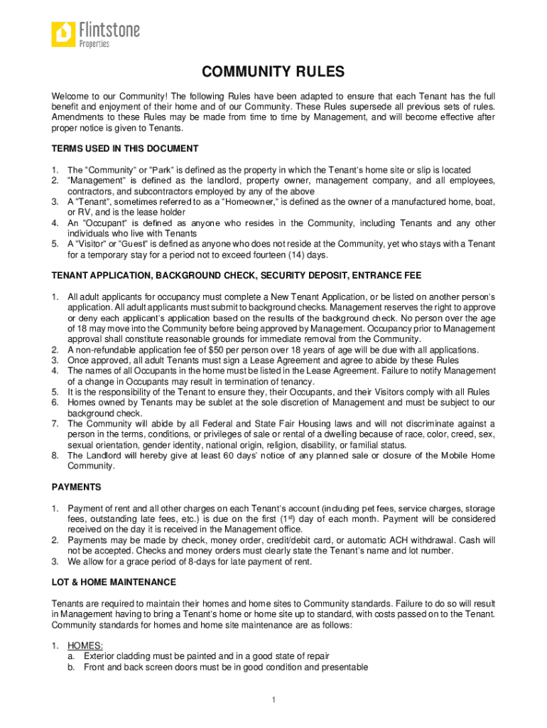COMMUNITY RULES Welcome to our Community! The following Rules have been adapted to ensure that each Tenant has the full benefit and enjoyment of their home and of our Community. These Rules supersede
