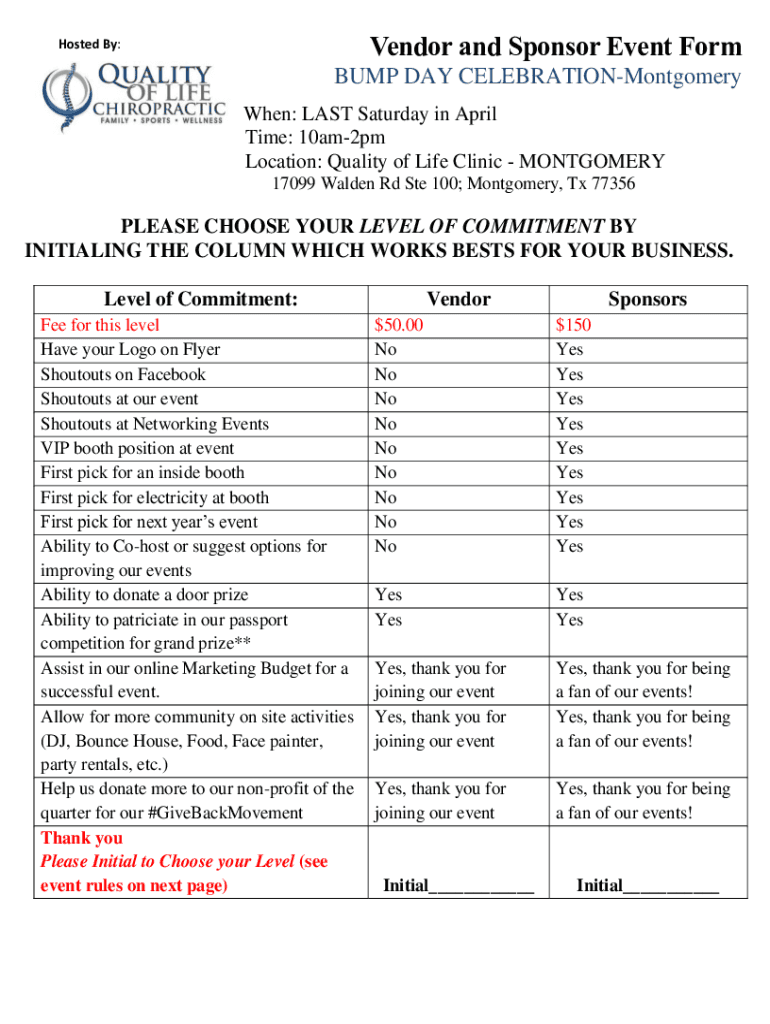 Vendor and Sponsor Event Forested By:BUMP DAY CELEBRATION Montgomery When: LAST Saturday in April Time: 10am2pm Location: Quality of Life Clinic MONTGOMERY 17099 Walden Rd Ste 100; Montgomery, TX