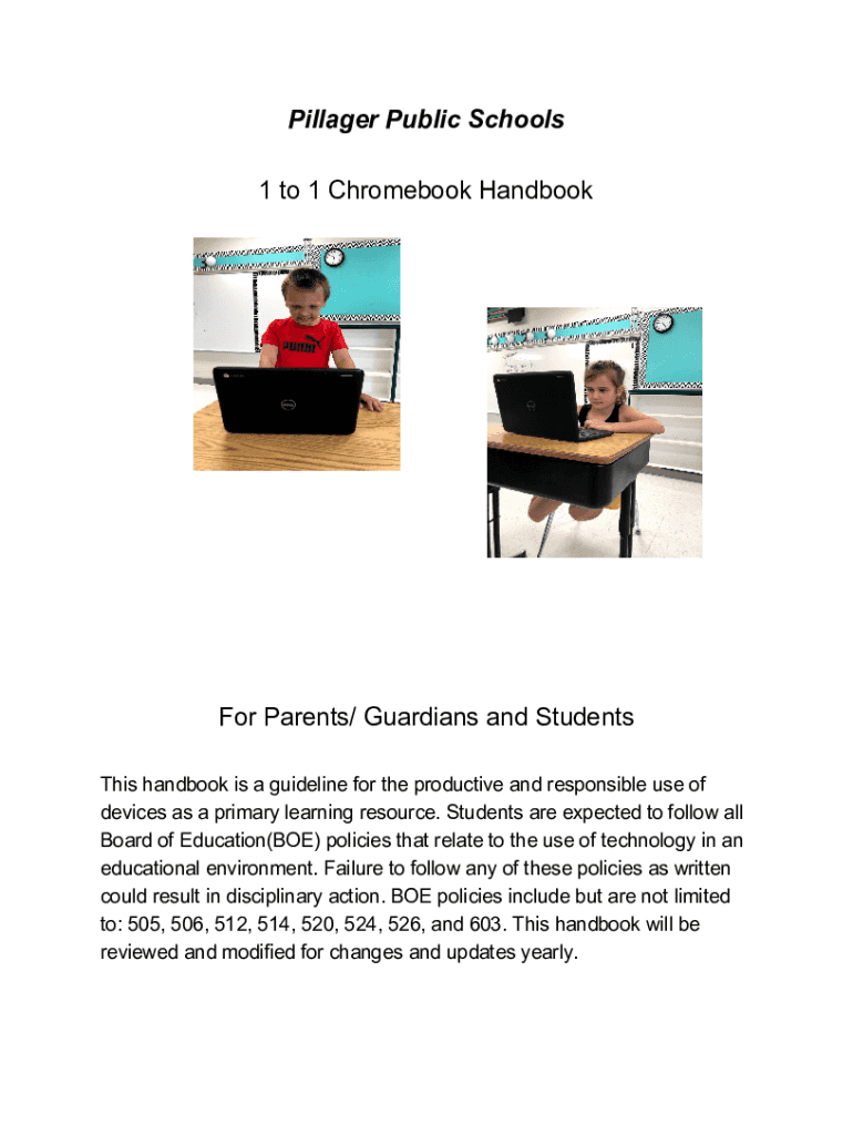 Pillager Public Schools 1 to 1 Chromebook Handbook Parents/ Guardians and Students This handbook is a guideline for the productive and responsible use of devices as a primary learning resource. Students