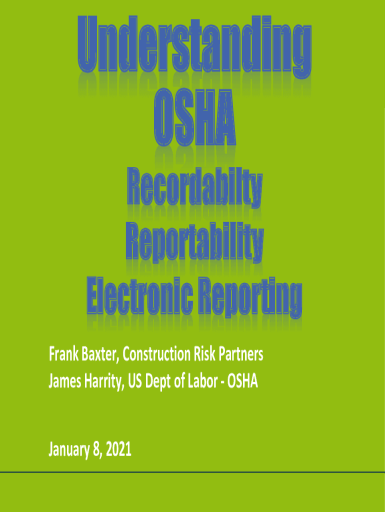 Understanding OSHA Recordable Re portability Electronic Reporting Frank Baxter, Construction Risk Partners James Garrity, US Dept of Labor OSHA January 8, 2021 1OSHA Record ability and Re portability