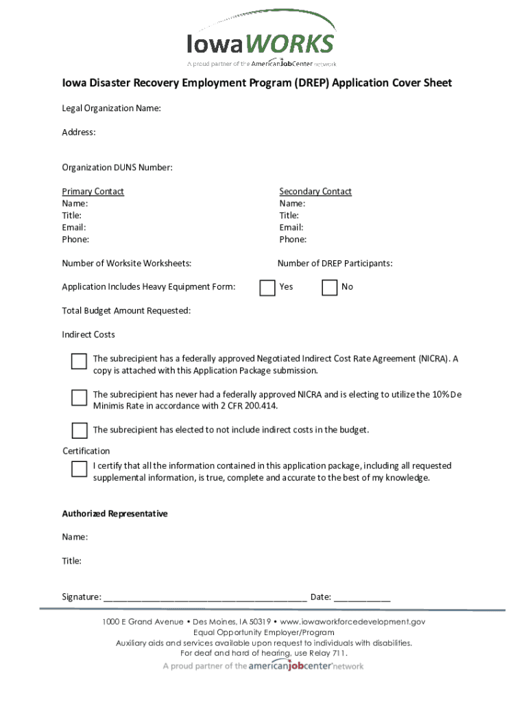 Iowa Disaster Recovery Employment Program (DEEP) Application Cover Sheet Legal Organization Name: Address:Organization DUNS Number: Primary Contact Name: Title: Email: Phone:Secondary Contact Name: