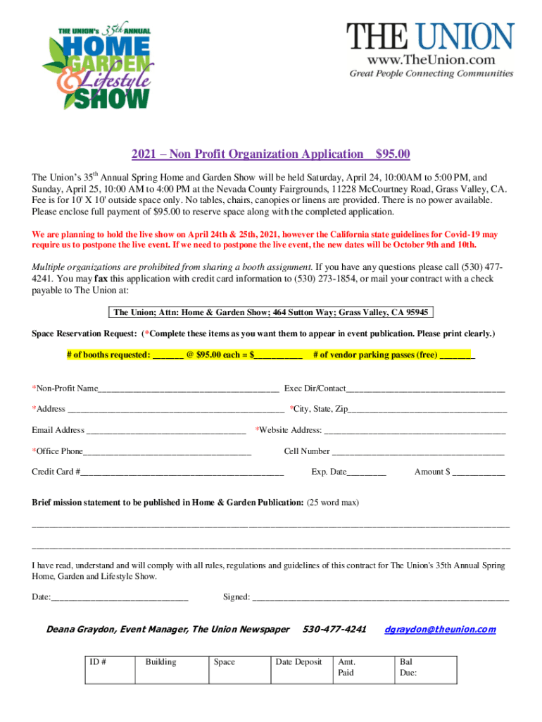 2021 Non Profit Organization Application $95.00 The Unions 35th Annual Spring Home and Garden Show will be held Saturday, April 24, 10:00AM to 5:00 PM, and Sunday, April 25, 10:00 AM to 4:00 PM at